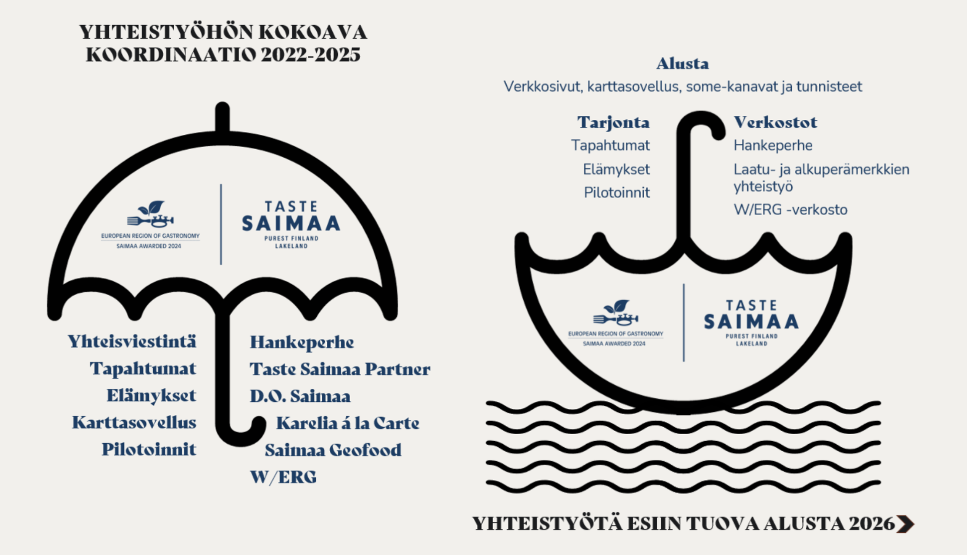Saimaa European Region of Gastronomy -juhlavuoden jälkeen ja koordinaatiohankkeen loppuessa työ ei pääty. Taste Saimaa -kokonaisuus jatkuu toivottavasti partneritoiminnan, uusien tapahtumien ja kehittämishankkeiden kautta. Tulevaisuudessa tavoitteena pitää olla pitkäjänteinen kehittäminen yksittäisten kampanjoiden sijaan, vahvistaen alueen brändiä.